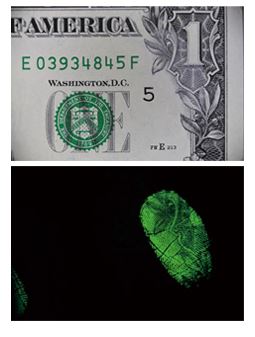 Anti-Stokes fingerprint powders provide an excellent alternative solution for imaging fingerprints on difficult surfaces such as highly patterned surfaces and multicoloured surfaces. The powder is illuminated with an invisible Infra-red light usually at 980nm and this produces an anti-stokes wavelength shift to produce a green visible fingerprint.