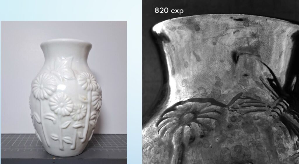 A ceramic vase multi faceted with latent marks recovered using 254nm and integration feature
