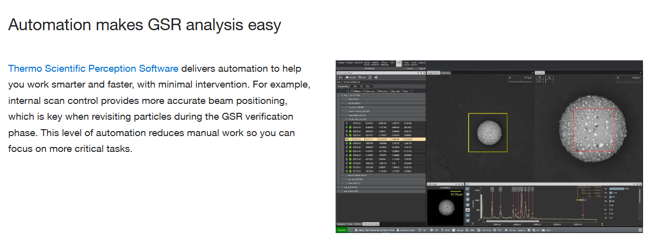 The Thermo Scientific Phenom ParticleX GSR Desktop SEM is the only dedicated SEM specifically designed for gunshot residue analysis. As the system is automated, it enables you to speed up the analysis process. With no need to change your settings each time, you can immediately focus on the task at hand.