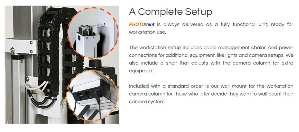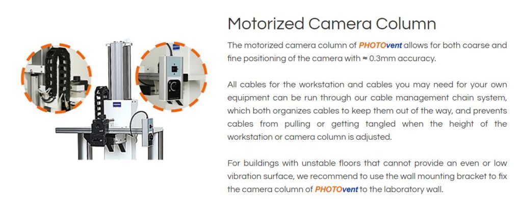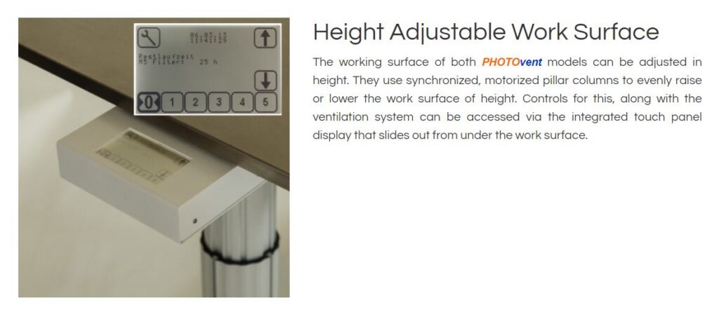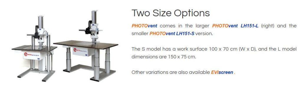 Our PHOTOvent workstations come in two sizes and have fixed height or motorized height adjustable options so they can be used sitting or standing. They also have a camera column with manual or motorized height adjustment options, depending on the needs of your camera system.