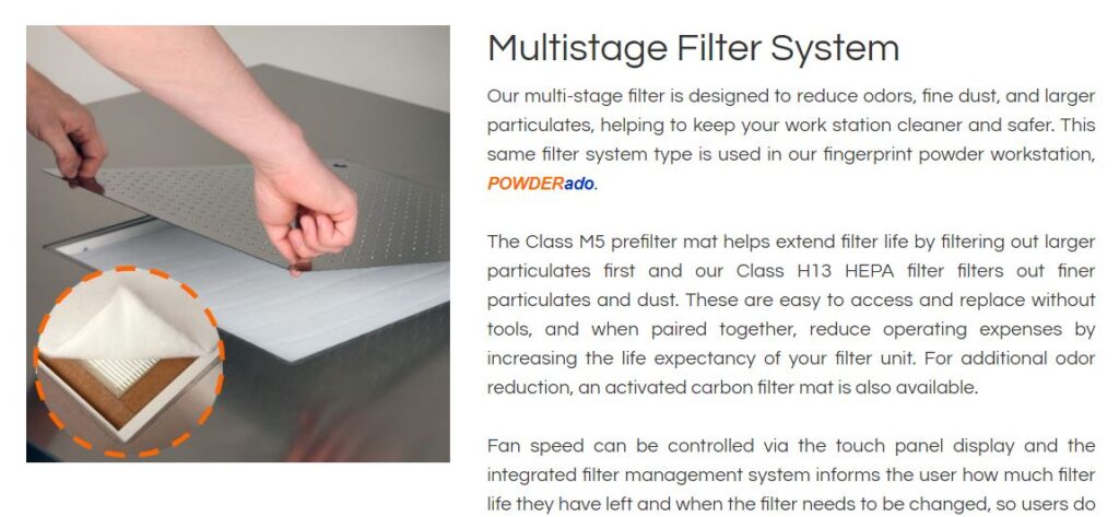 PHOTOvent‘s special integrated filter system is built right into the work surface itself. Fumes and loose particulates like dust and fingerprint powders get pulled down into our multi-stage filter system to reduce the risk of inhalation and contamination without needed any external ventilation hookups.