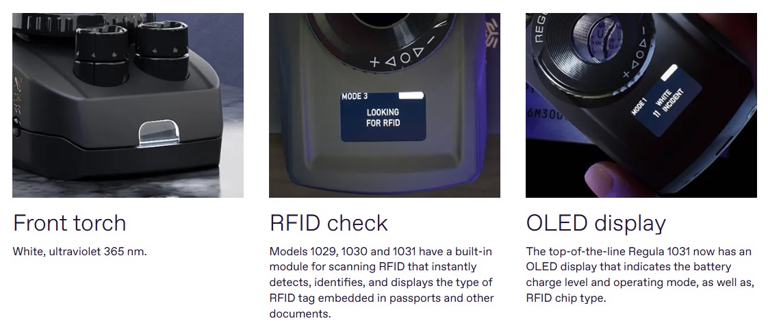 The flagship model Regula 1031 has an extended kit of light sources: white (incident, oblique, and coaxial, for OVD visualization), ultraviolet (254, 310, 365, 400 nm), infrared 850 nm, high-intensity infrared 980 nm and others. Features a torchlight mode with white light for see-through document checks and ultraviolet 365 nm light for quick review of an entire document page at a glance. In total there are 19 lighting modes.