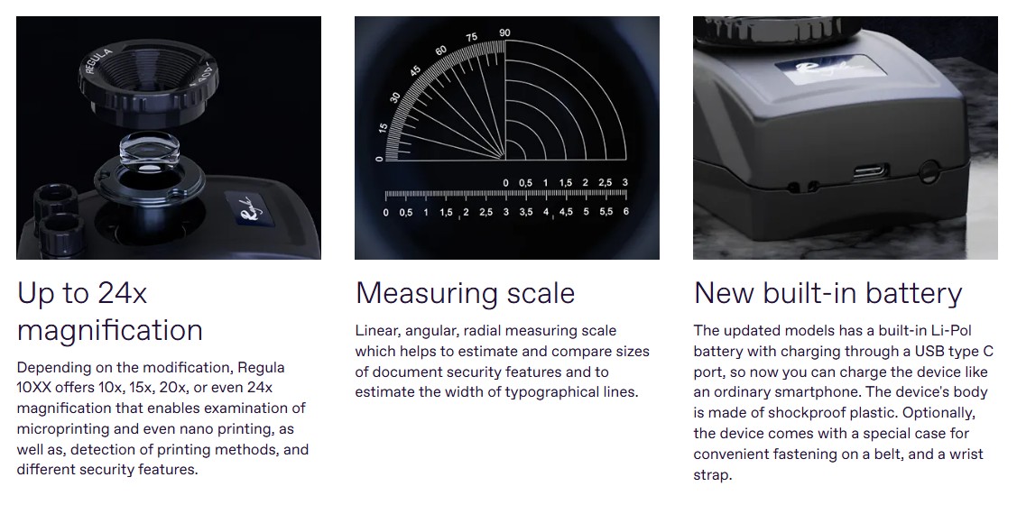 The Regula 10XX series of compact forensic magnifiers are devices are intended for express authenticity verification and advanced examination of passports, ID cards, travel documents, visa stamps and seals, including but not limited to entry permits, banknotes, driving licenses, vehicle registration certificates and other vehicle related documents, signatures and handwriting fragments, revenue and special stamps, securities and other documents with security features. The battery operated devices combine LED lighting and optional scales with 5 standard models to choose from.