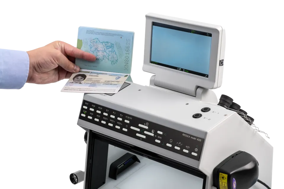 The desktop device Regula 4325 is intended for first-line verification of documents. It is operated with control buttons on the front panel. The control buttons are used to activate light sources and adjust the camera parameters, as well as the thermostage temperature (+10…+50˚С). The device is equipped with a 7-inch screen. Additionally, an extra monitor can be connected.