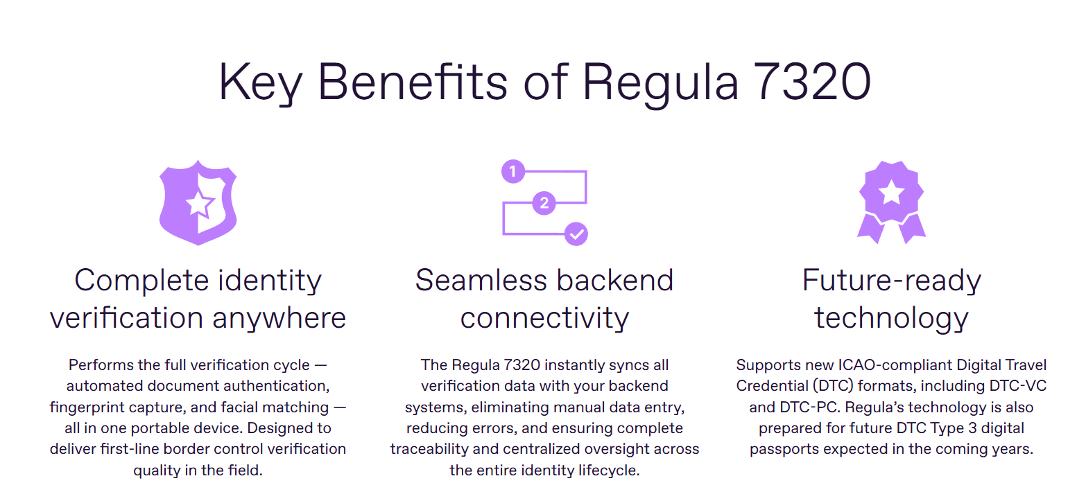 Regula 7320 combines the entire verification cycle—automated document authenticity checks, data extraction, fingerprint capture, and facial matching—in one compact, fully integrated system. Enhanced UV/IR algorithms, improved illumination, and an optimized optical system provide verification quality comparable to stationary border-control systems, now available in a truly portable format and seamlessly compatible with the Regula IDV Platform.