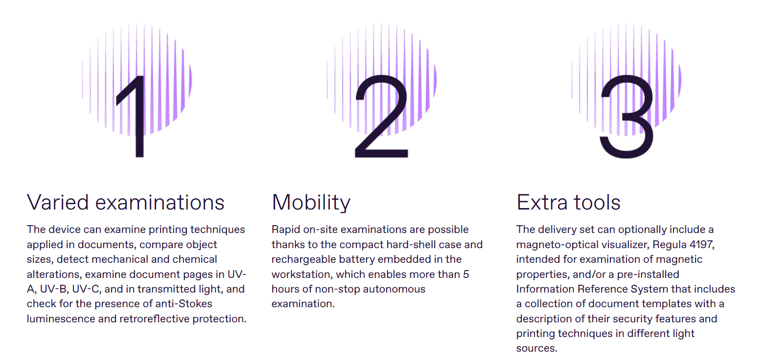 The Regula 8003M is a portable system for verification of currency and / or ID documents. This mobile workstation is intended for on-site express authenticity verification and advanced examination of all types of travel documents, banknotes, visa stamps and seals, entry permits, driver’s licenses, and other documents with security features.