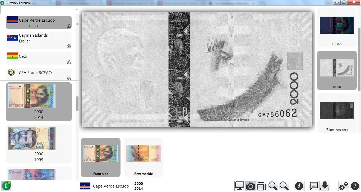 Banknotes in white, IR 400–530, 870 and >940 nm, UV 254, 313 and 365 nm spectrum ranges