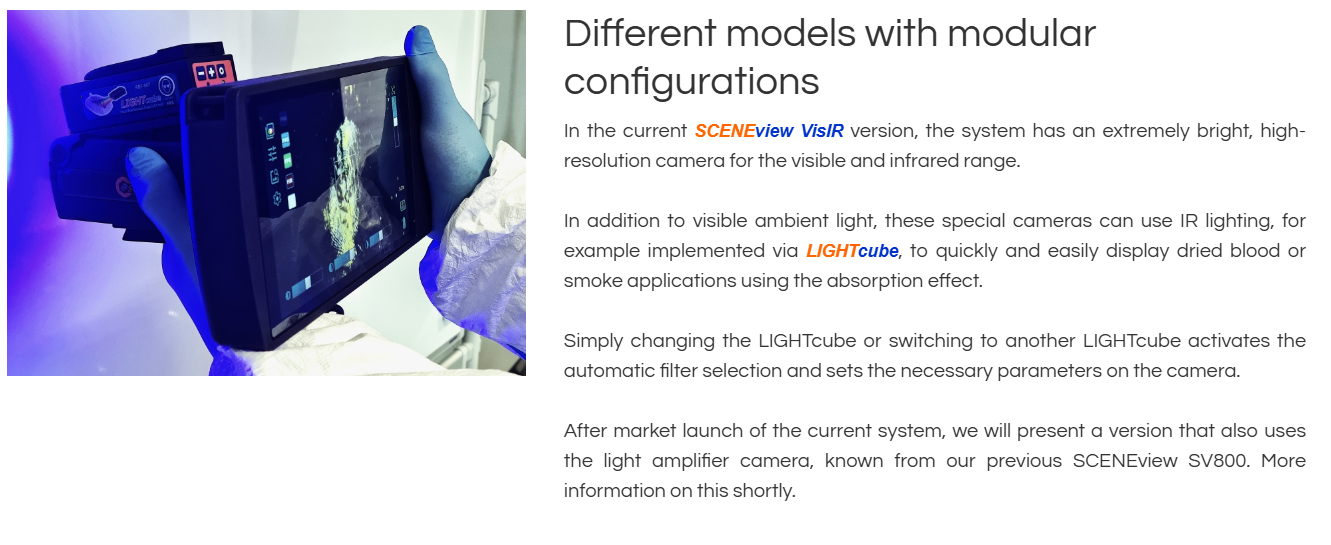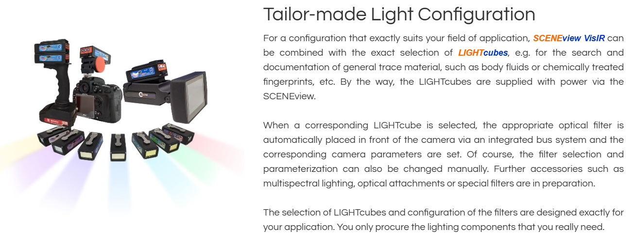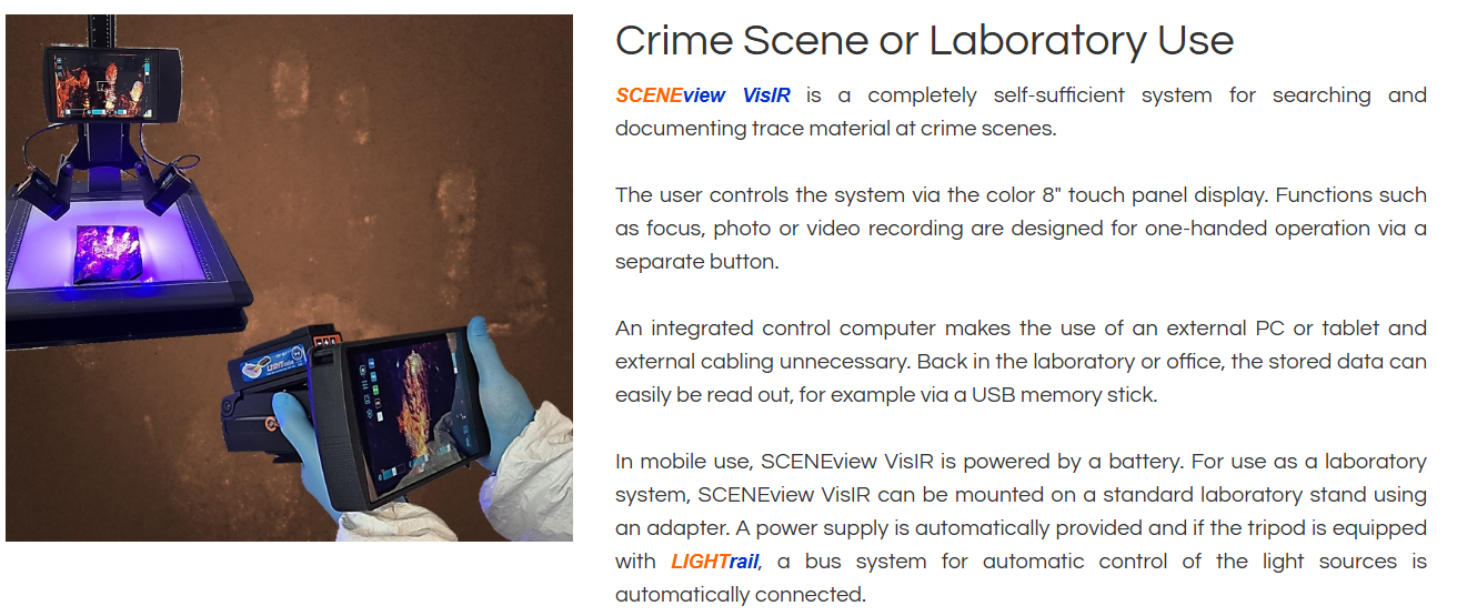 SCENEview VisIR is our latest development and the first component in a completely new product family of camera systems and accessories for evidence photography at crime scenes and in the laboratory.