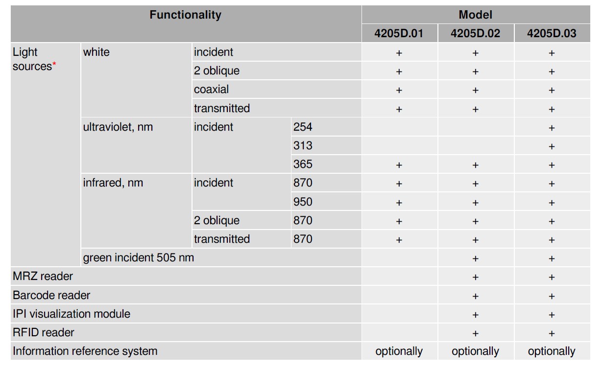 Regula 4205D is equipped with modules for reading MRZ, IPI, barcodes and RFID chips. It can be optionally supplied with an integrated information reference system to compare the examined document with the corresponding document template from the database.