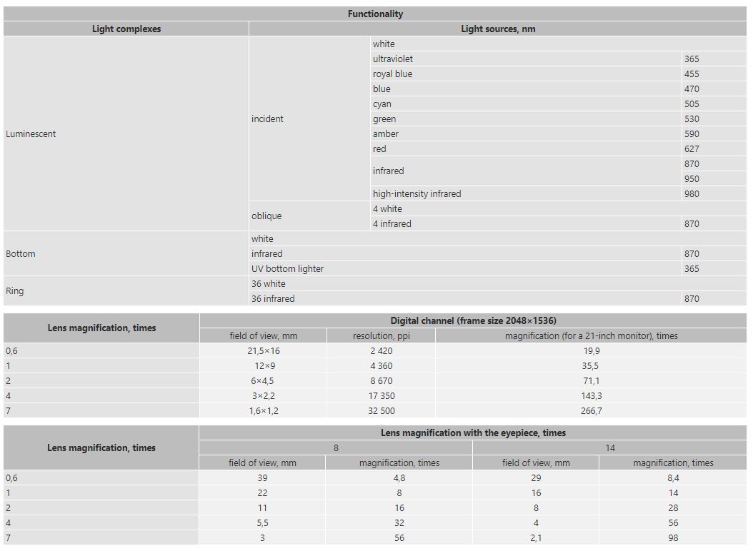 The device has a set of light sources of visible, infrared and ultraviolet spectral ranges and imaging filters used for carrying out forensic expertise. The microscope enables to capture, process and store digital images of examined objects and perform additional visual control using the binocular nozzle.