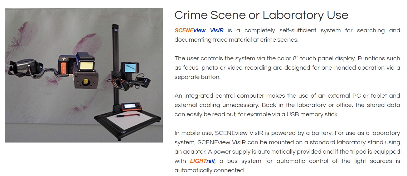 - the all new evidence camera for search and documentation of evidence material like fingermarks, body fluids, blood, gunshot residue and much more. SCENEview VisIR is our latest development and the first component in a completely new product family of camera systems and accessories for evidence photography at crime scenes and in the laboratory. In addition to identifying possible perpetrators, traces found at the crime scene often allow valuable conclusions to be drawn about the sequence and course of a crime. Sceneview VisIR is a universal tool for the search, recognition and documentation of traces such as body fluids (e.g. saliva, urine, seminal fluid), blood, traces of smoke, fibres, hair, fingerprints and much more. SCENEview VisIR is the first component of the product family and the basic system, based on a modern camera system with high light sensitivity even in the IR range, very fast autofocus and modern and user-friendly operation via touchscreen display. In order to ensure simple and intuitive operation, SCENEview VisIR focuses on components and functions that are actually required in forensic applications. Our LIGHTcube forensic lighting system provides you with extremely powerful, narrow-band, high-performance lighting in 12 different light colours from ultraviolet to infrared, which can be tailored to your applications in a modular manner.
