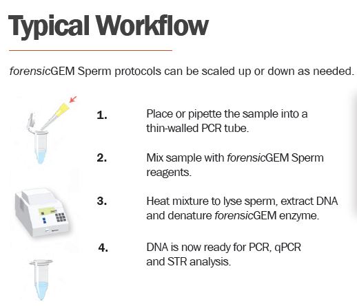 Effortless, DNA extraction from sexual assault samples forensicGEM Sperm utilizes Exymes novel thermophilic proteinase and Acrosolv reagent to lyse sperm without the use of qPCR and STR inhibiting chemicals, such as SDS, mercaptoethanol and DTT. Sample types: semen swabs, stains & liquid semen
